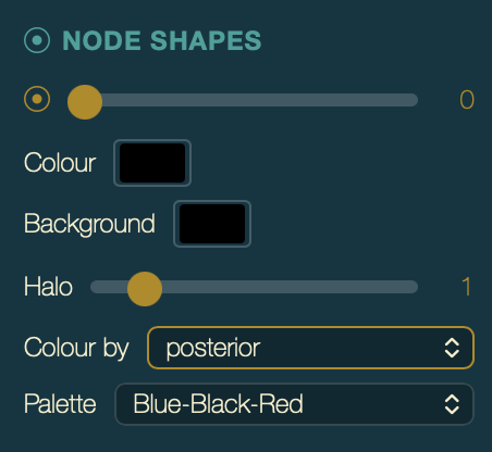 posterior ≥ 0.95— you can achieve this visually by choosing a palette that maps values below your threshold to the background colour, making low-support nodes invisible. Alternatively, use Node Labels to display the exact value as text on specific nodes only.