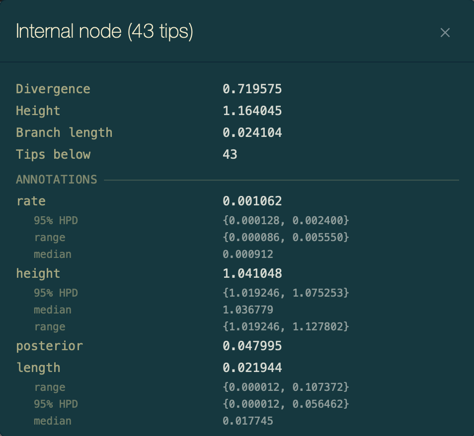 [!TIP] If the HPD bars make the tree look cluttered, try setting Bar height to 1 px and removing the Line tick. For publication use, HPD bars are most useful in a zoomed-in view of a key clade — use the drill-down function (double-click any internal node) to focus on the clade of interest.