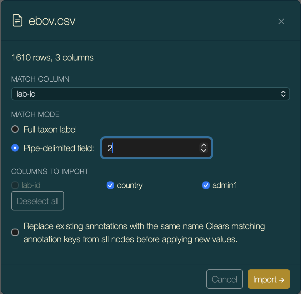 In the match configuration step, set Match on field to 2 — the second pipe-delimited segment of each tip label is the sample ID, which matches the lab-id column in the CSV.