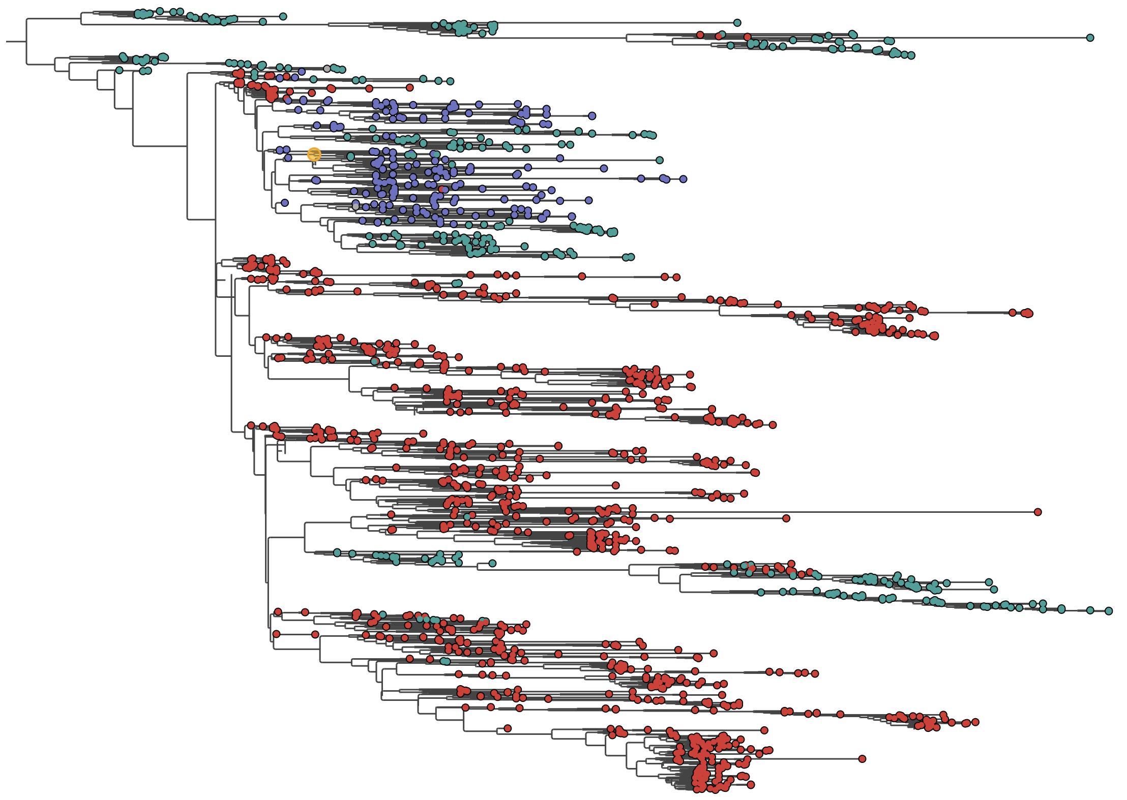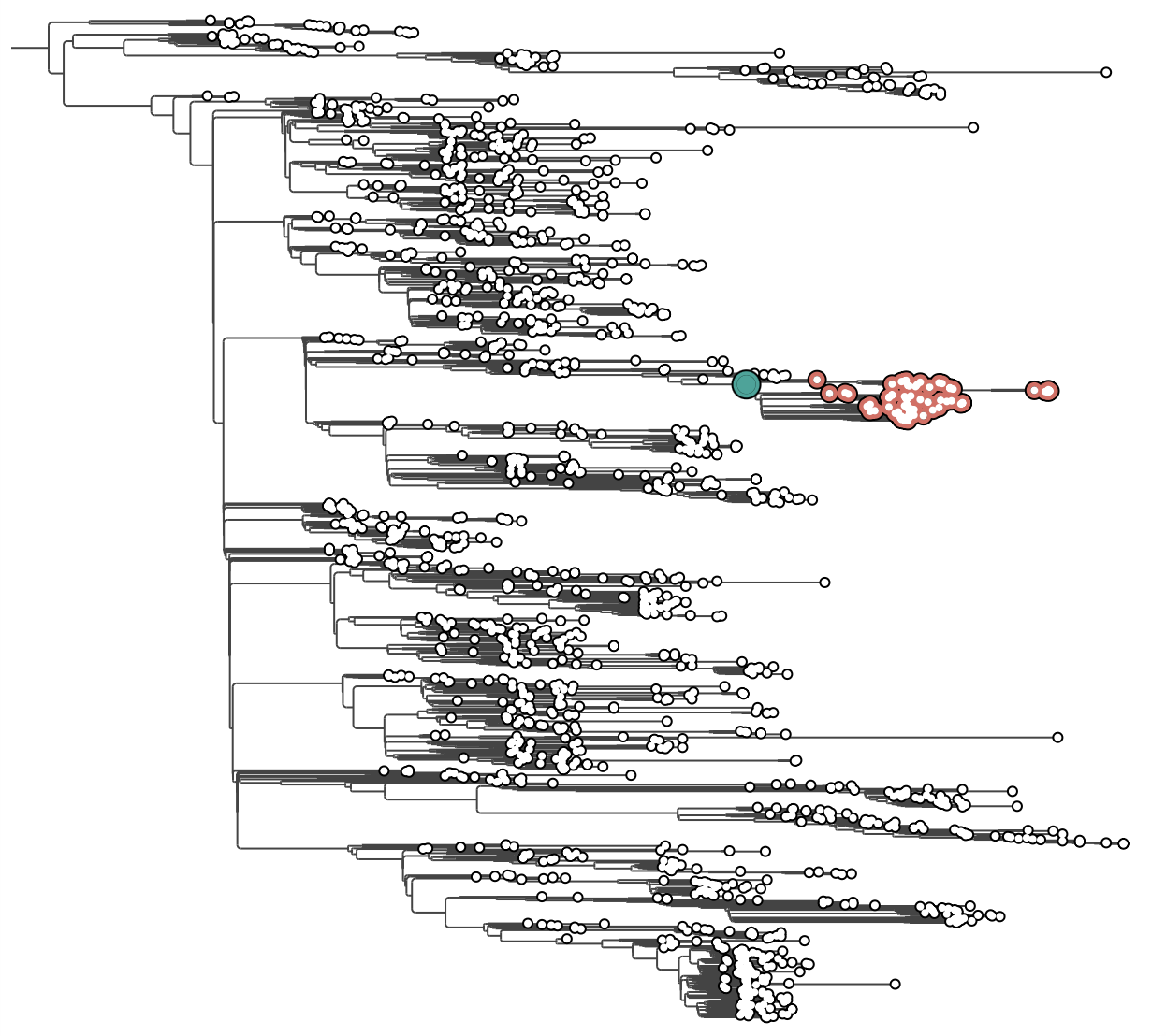 To inspect a specific clade in detail, double-click any internal node to drill down into it: