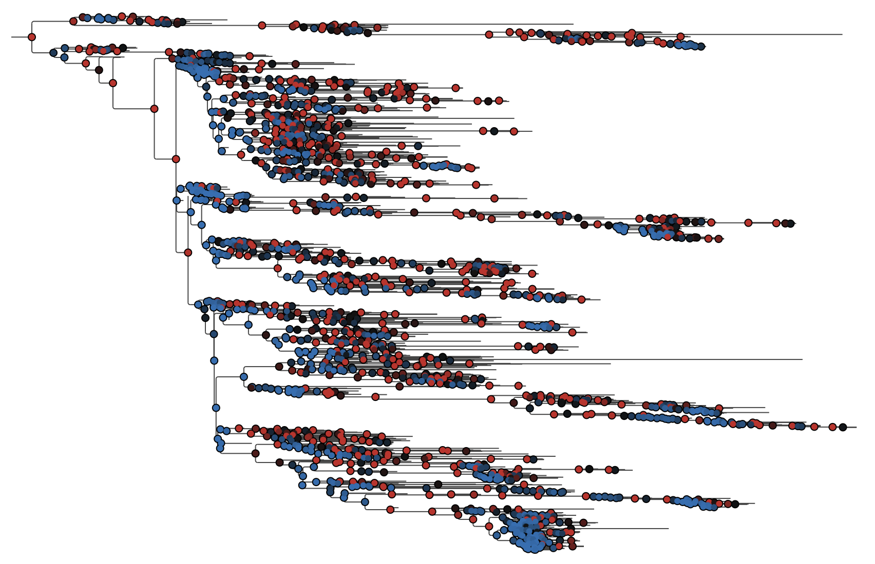 EBOV tree with internal nodes coloured by posterior support. Red = high support (≥0.95), blue = low support (≤0.5).