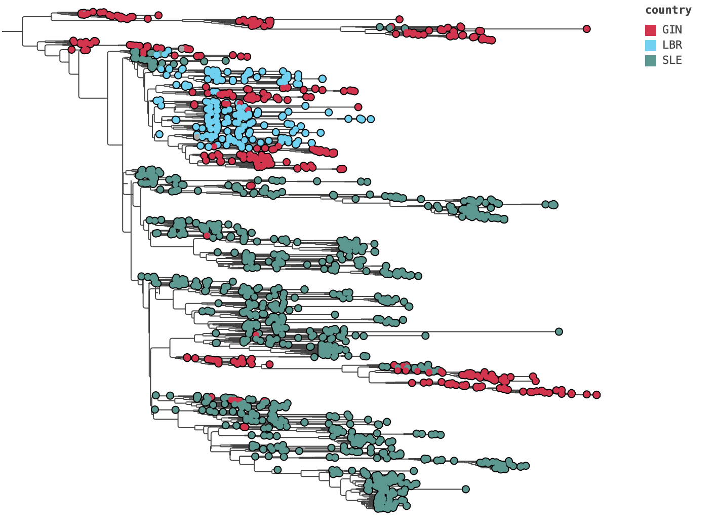 EBOV tips coloured by sampling country. Mixing of countries across the tree reflects the regional connectivity of the epidemic.